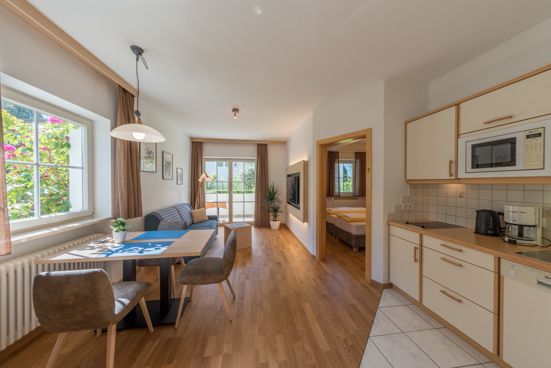Unser grösstes Apartment, ca. 43 m2, mit Holzboden grosser Veranda (ca. 9 m2) mit Süd- & Westausrichtung und Gartenblick.