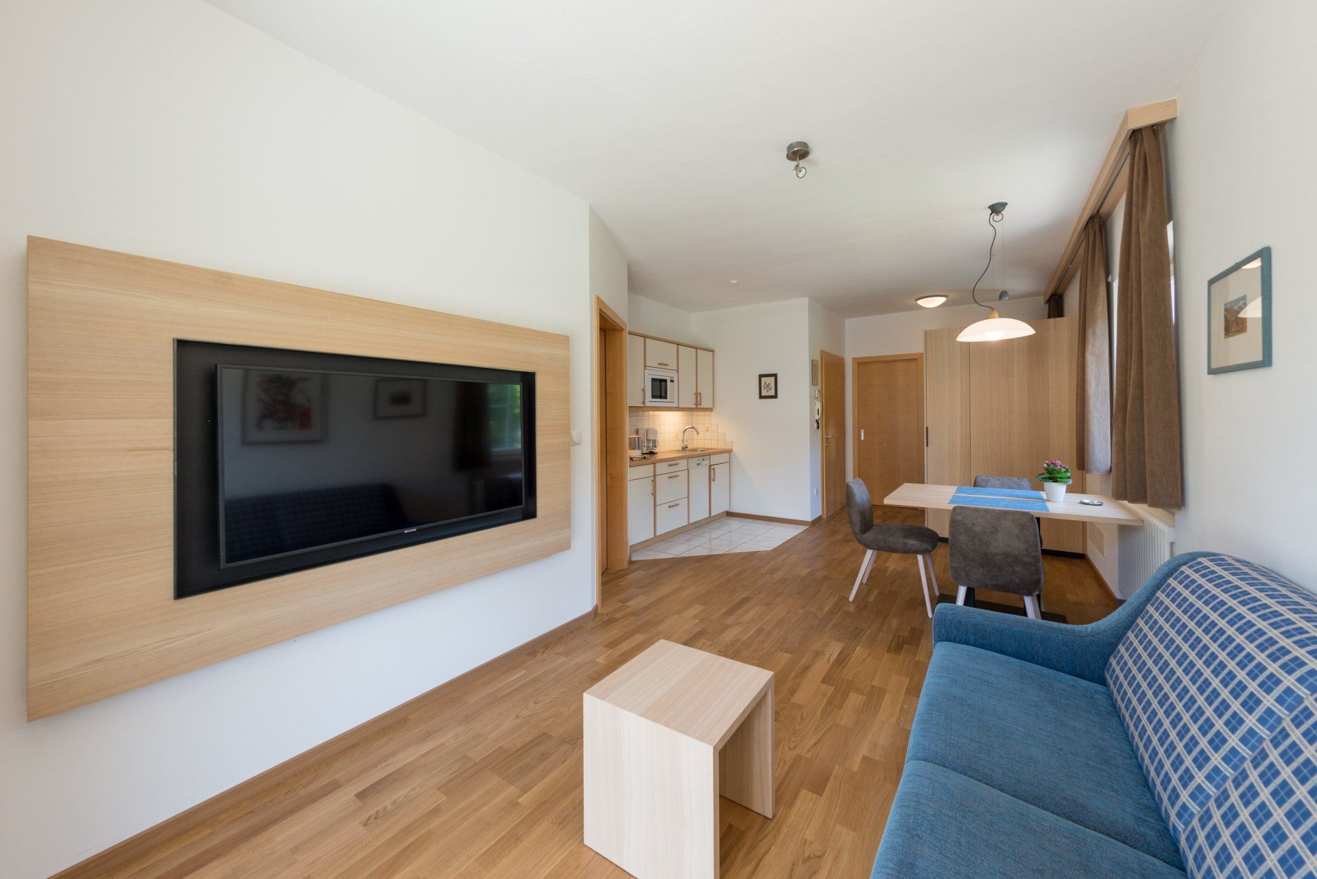 Im Wohn-/Essbereich finden Sie ein Schlafsofa und grossen Sat-TV, die Küchenzeile mit Cerankochfeld, Geschirrspüler und Mikrowelle.