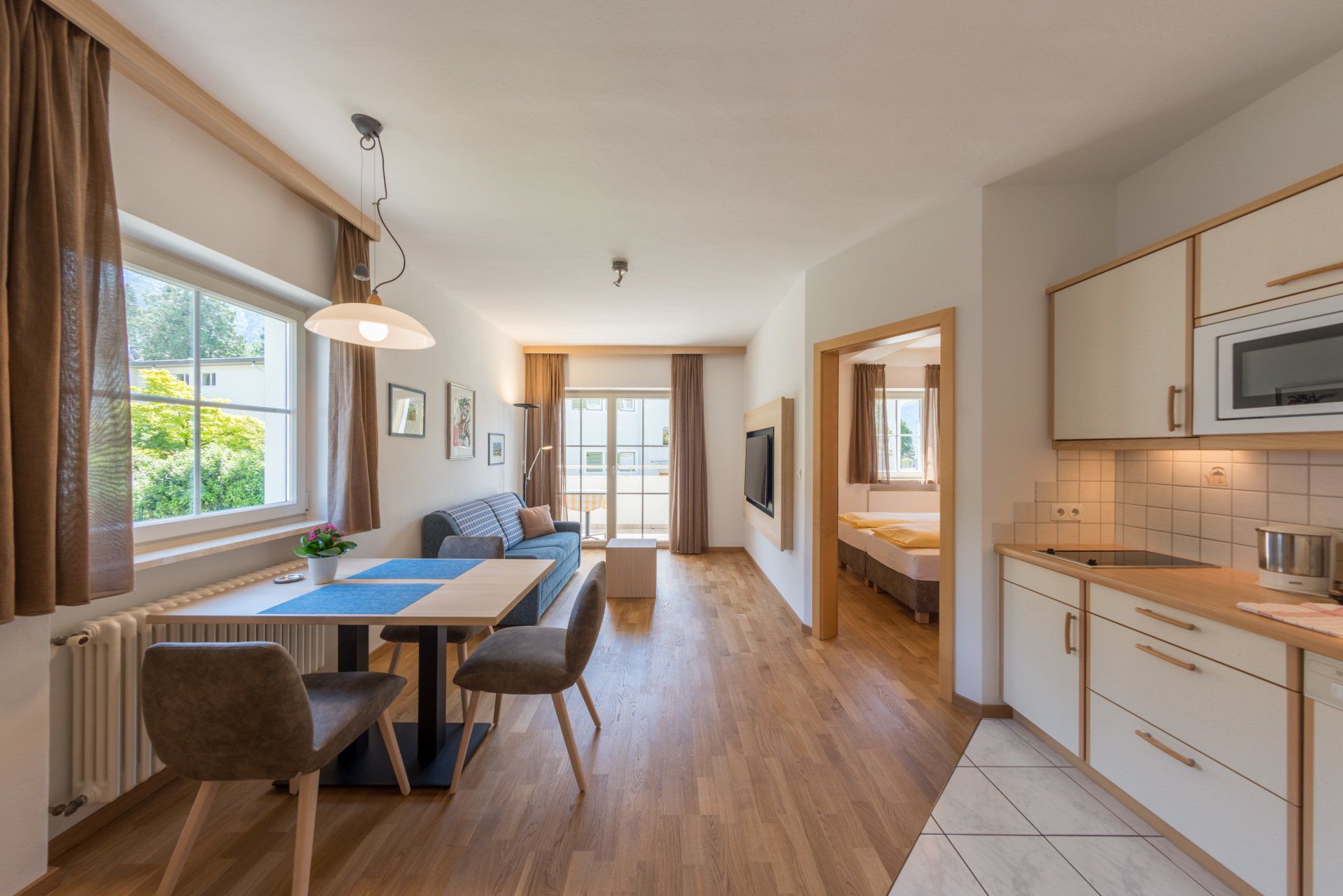 Unser grösstes Apartment, ca. 43 m2, mit Holzboden grosser Veranda (ca. 9 m2) mit Süd- & Westausrichtung und Gartenblick.
